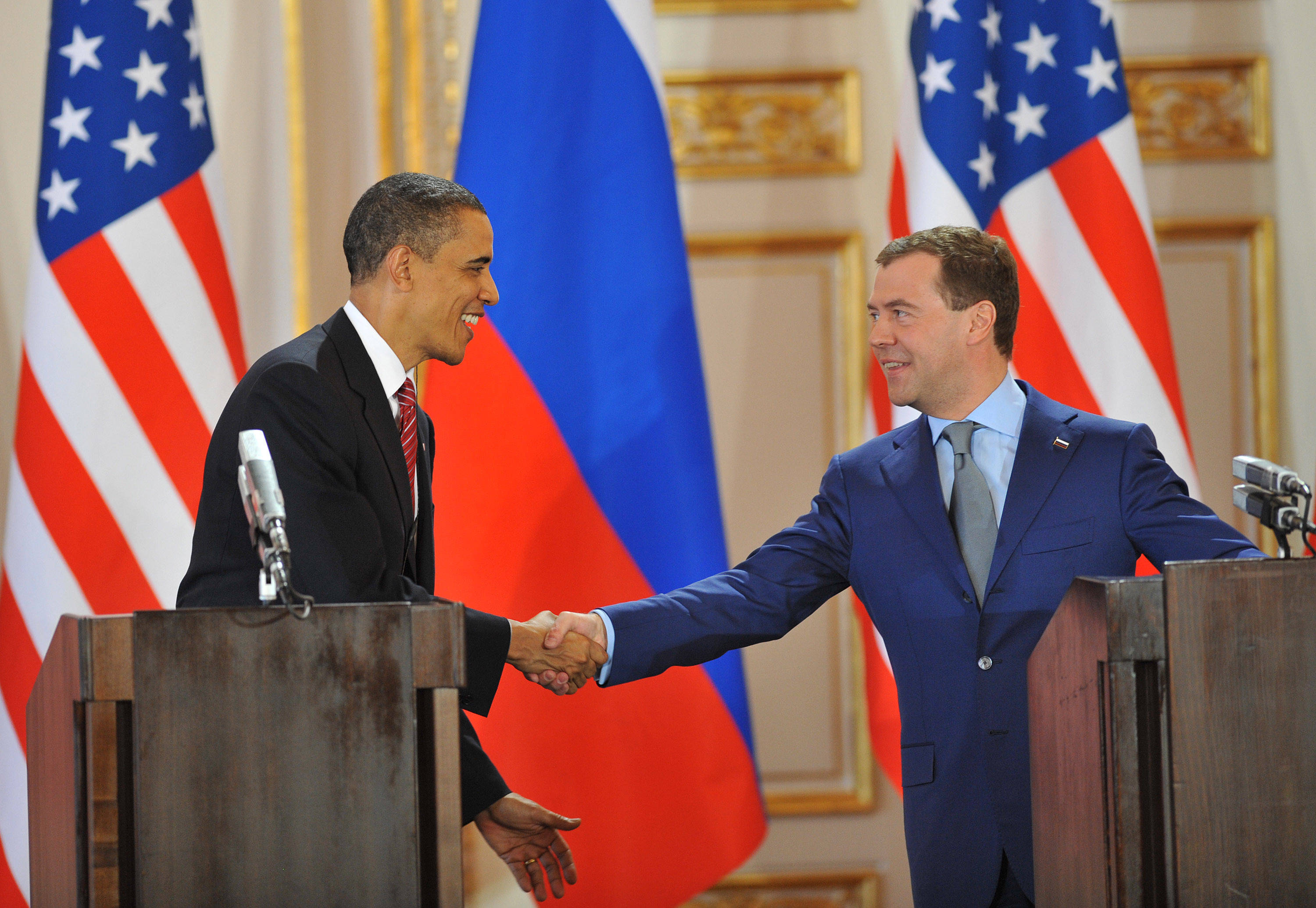 这张拍摄于2010年4月8日的资料照片显示,时任美国总统奥巴马(左)和时任俄罗斯总统梅德韦杰夫在捷克首都布拉格签署新核裁军条约后出席新闻发布会时握手。 新华社记者武巍摄该条约对美国和俄罗斯部署的核弹头和载具数量加以限制,规定双方部署的战略核弹头数量不得超过1550枚,部署的洲际弹道导弹、潜射弹道导弹和配备核武器的重型轰炸机不得超过700件,部署和未部署的洲际弹道导弹和潜射弹道导弹发射装置,以及重型轰炸机数量不得超过800件。