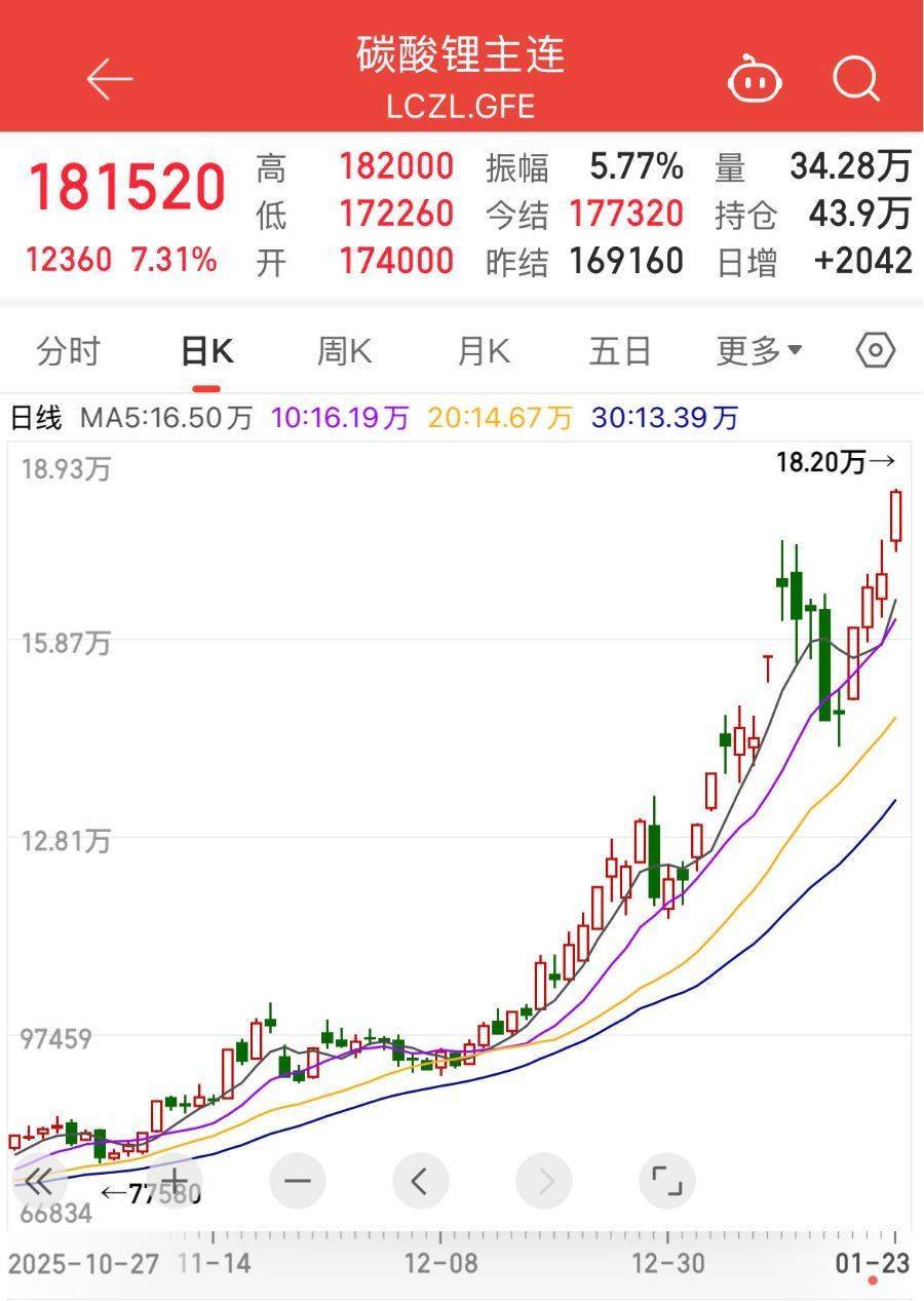 1月23日,碳酸锂市场延续强势上行态势配查查配资,碳酸锂期货主力合约盘中拉升超7%,一举突破18万元/吨整数关口,截至收盘报181520元/吨,市场交投活跃度显著提升。