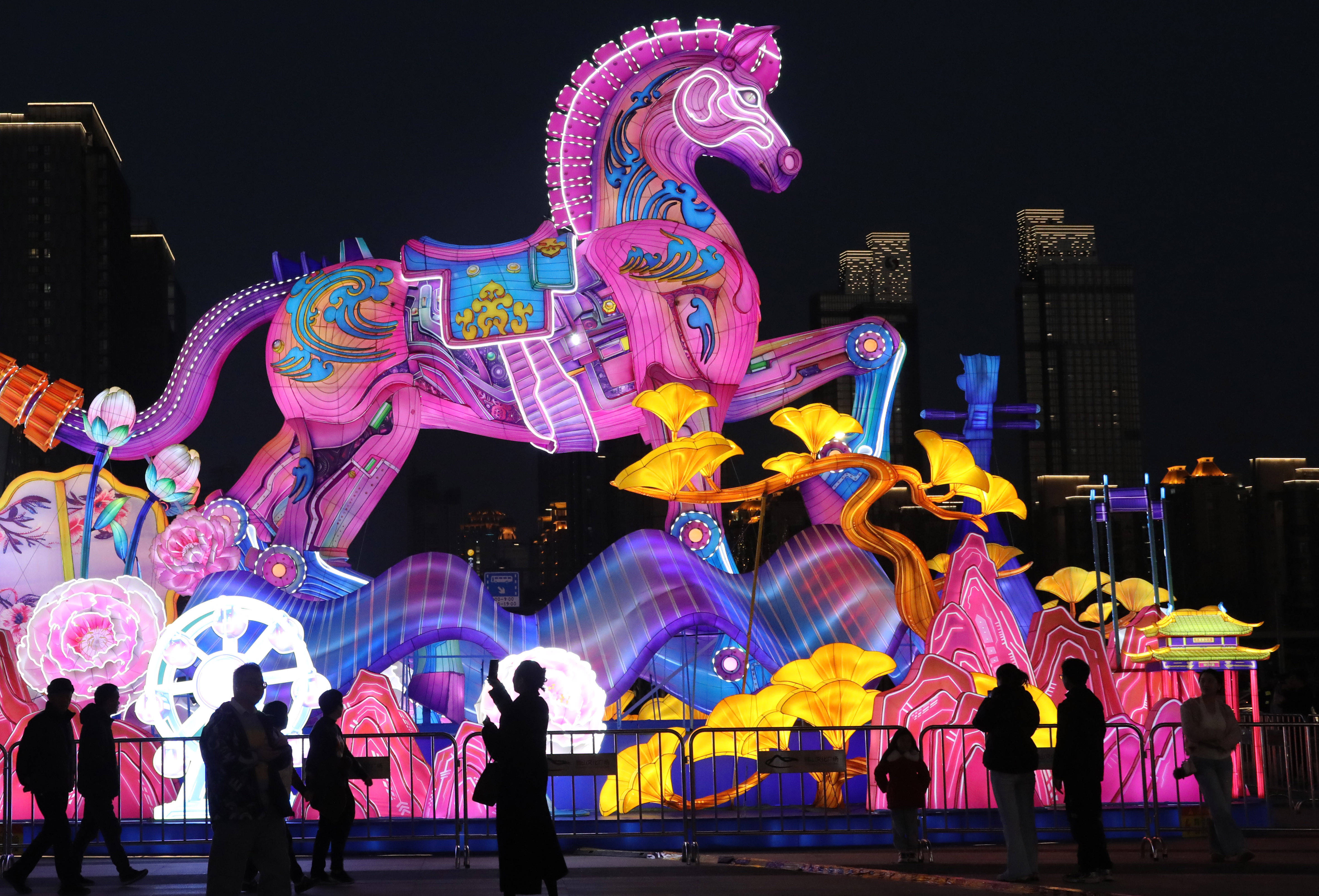 游客在江苏苏州狮山文化广场赏灯游玩。 新华社发(杭兴微 摄)丙午马年,意义非凡。“十五五”开局,蓝图已经绘就,改革开放步伐不停,新质生产力拔节生长。