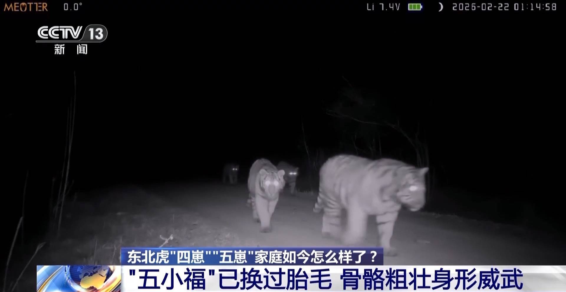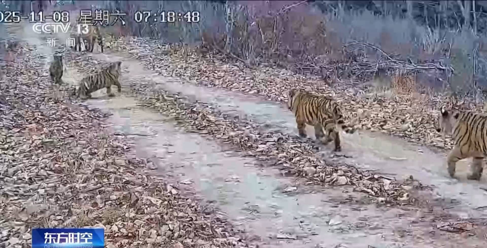 2025年11月初,同样是在珲春,野外触发式红外相机在三天内两次记录到了“一虎带五崽”的画面。一只体形修长、花纹斑斓的母虎,正带着它的几只幼崽在镜头前嬉戏。经反复对比确认,母虎一共带着五只幼崽,一家六口整整齐齐地出现在红外相机的镜头当中。这个被监测人员戏称为“六福同框”的世界罕见影像,鲜活印证了发生在吉林珲春原野中的真实奇迹。这些珍贵画面经由总台央视新闻频道播出,一时成为关注的焦点。