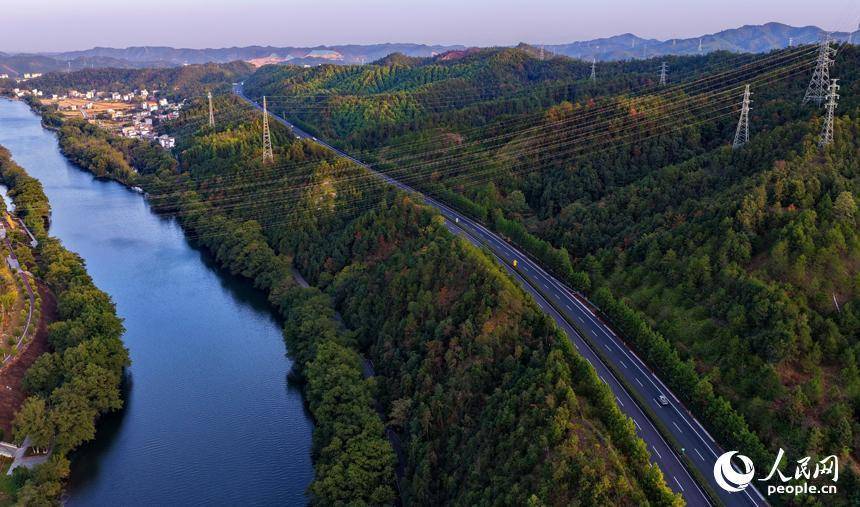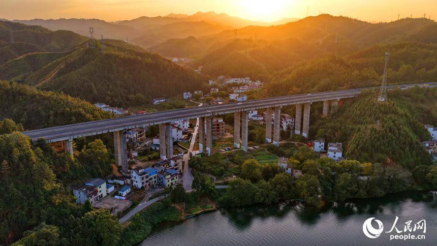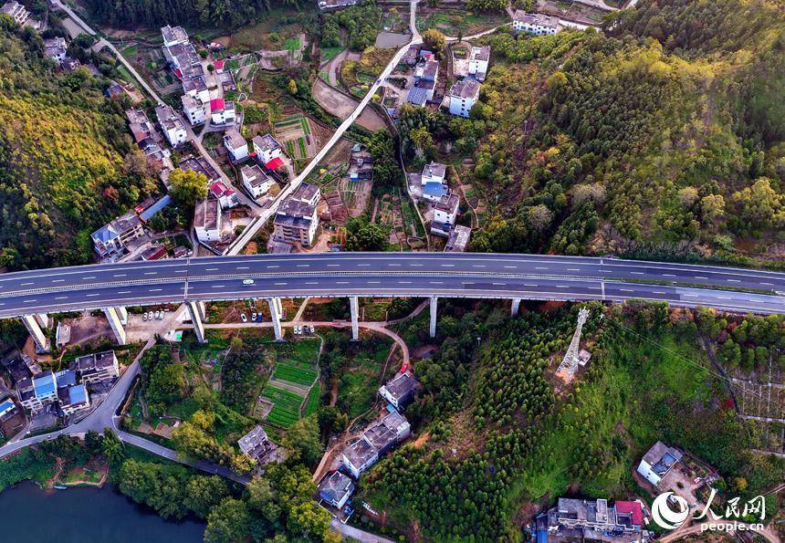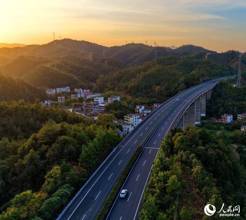 厦蓉高速公路赣州市上犹县黄埠镇路段,车辆往来驰骋,公路沿线乡村冬景怡人。人民网记者 朱海鹏摄