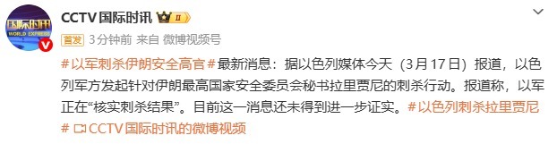 据CCTV国际时讯,以色列媒体今天(3月17日)报道,以色列军方发起针对伊朗最高国家安全委员会秘书拉里贾尼的刺杀行动。报道称,以军正在“核实刺杀结果”。目前这一消息还未得到进一步证实。